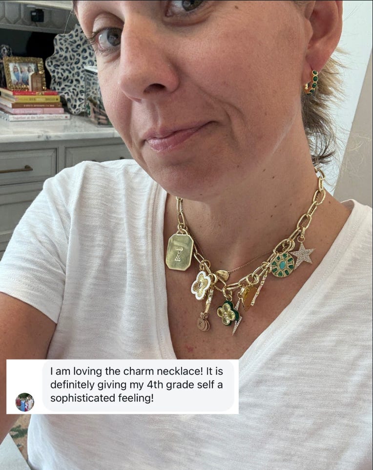 Riiiiiight…. Do you not love it. I’ll be honest, I always like the idea of a charm bracelet but reality is- those charms get in my way when I am using my hands. Maybe I’m just high maintenance (no comment needed, JT), but a charm necklace is pretty genius. It also happens to be on trend, and, this one, designed through a collaboration of some of my gal pals (Natasha + Allie & Bess).