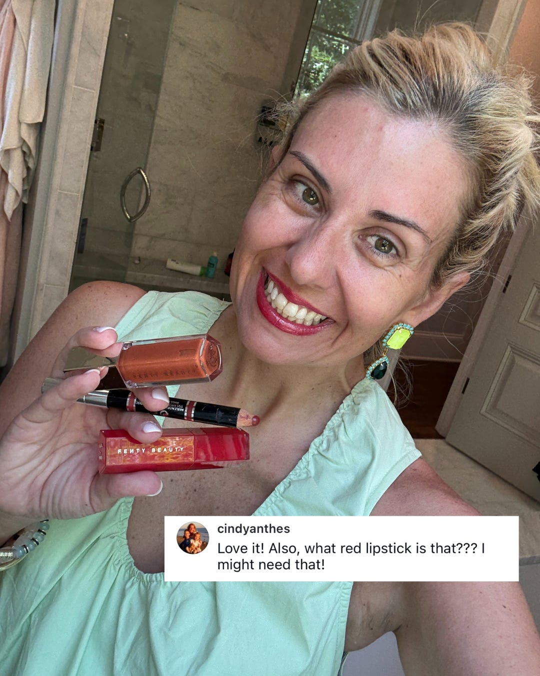 Y’all don’t miss a beat! You were so curious about my fun lip in this reel this week. I’m loving this Fenty Beauty Gloss Stick in shade MVP, which gives us the perfect pop of red when we need it. My go-to everyday combo? This Fenty gloss (in any shade…I’m obsessed) paired with Merle Norman’s lip pencil in Peach Brandy, Antique Rose, or Coral Rust.