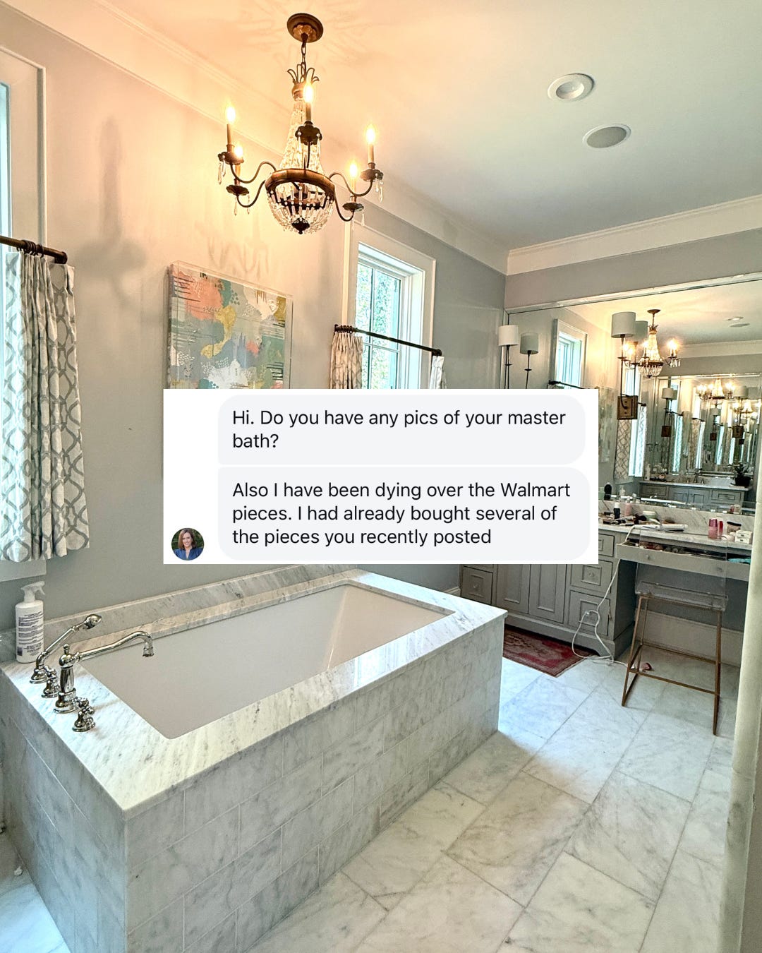 Okay y’all, I am so grateful for an awesome master bath that actually makes getting ready fun. But please, don’t zoom in on my messy counters - ha! Quick question: are y’all tub people? Because I’m definitely not, but at least she’s pretty enough to make up for being so dang large that I run into her 24/7.