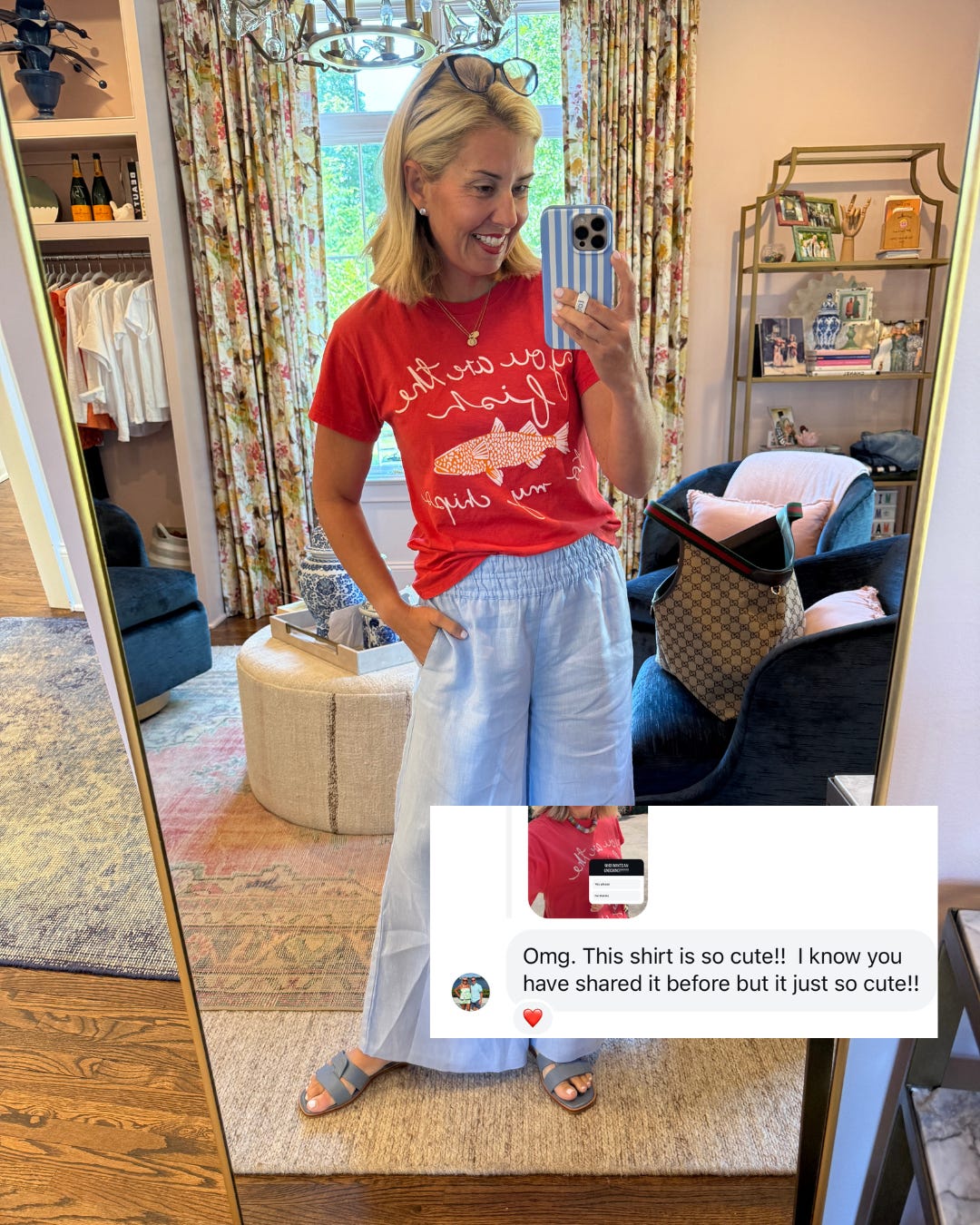Y’all, this red ‘You’re the Fish to My Chips’ tee has been on repeat for a reason!! Graphic tees like this are closet MVPs - they go with everything! Jeans, skirts, layered under a blazer…basically, they make every outfit easier (and cuter). Linking this full look, plus other fun options below!